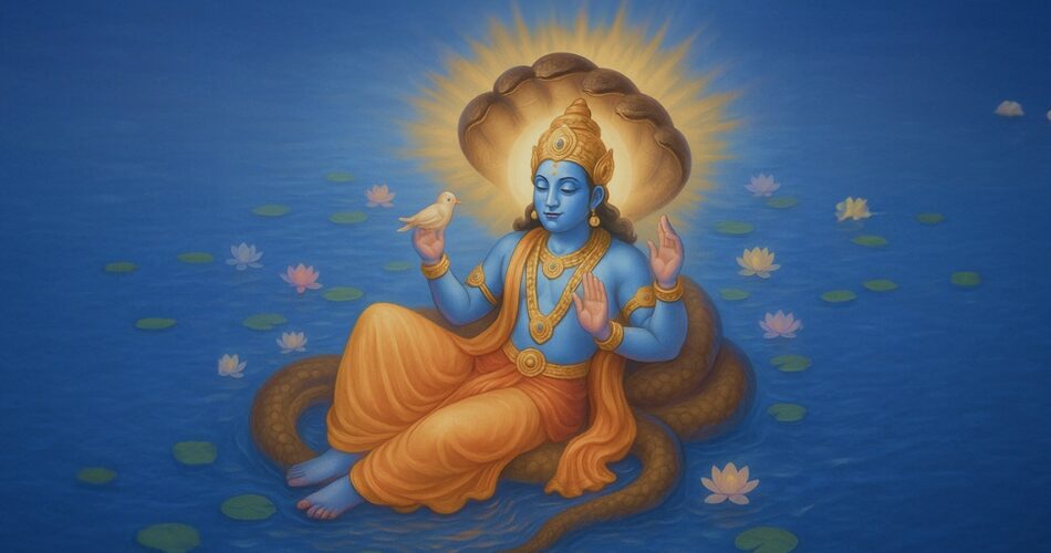 - (Salutations to Sri Vishnu) Who has a Serene Appearance, Who Rests on a Serpent (Adisesha), Who has a Lotus on His Navel and Who is the Lord of the Devas,